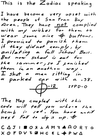 Map letter sent to San Francisco Chronicle on June 26, 1970 (postmarked San Francisco) - to date the cipher remains unsolved