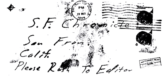 Envelope for Stine letter sent to San Francisco Chronicle on October 13, 1969 (postmarked San Francisco)